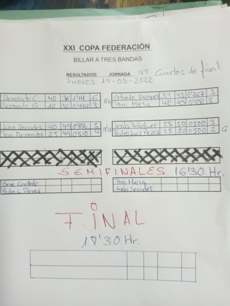 XXI COPA FEDERACIÓN DE BILLAR A 3 BANDAS. Cuartos de final Publicado el 19 mayo, 2022 por federacionasturiana Resultados de Cuartos de Final y enfrentamientos y horarios de semifinales y final. Comparte esto: Compartir en X (Se abre en una ventana nueva) X Comparte en Facebook (Se abre en una ventana nueva) Facebook Me gusta Cargando...