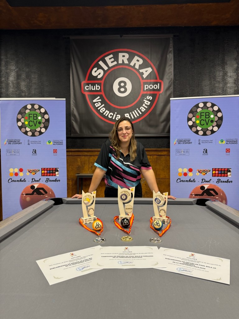 La gran protagonista en la categoría femenina fue Mirella Feito, que continúa agrandando su leyenda. Se proclamó por segunda vez Campeona de España, esta vez en la modalidad de Bola 8, y además logró ser subcampeona en Bola 9 y Bola 10, alcanzando la final en las tres modalidades. Una actuación sobresaliente que reafirma su lugar entre las mejores jugadoras del panorama nacional.